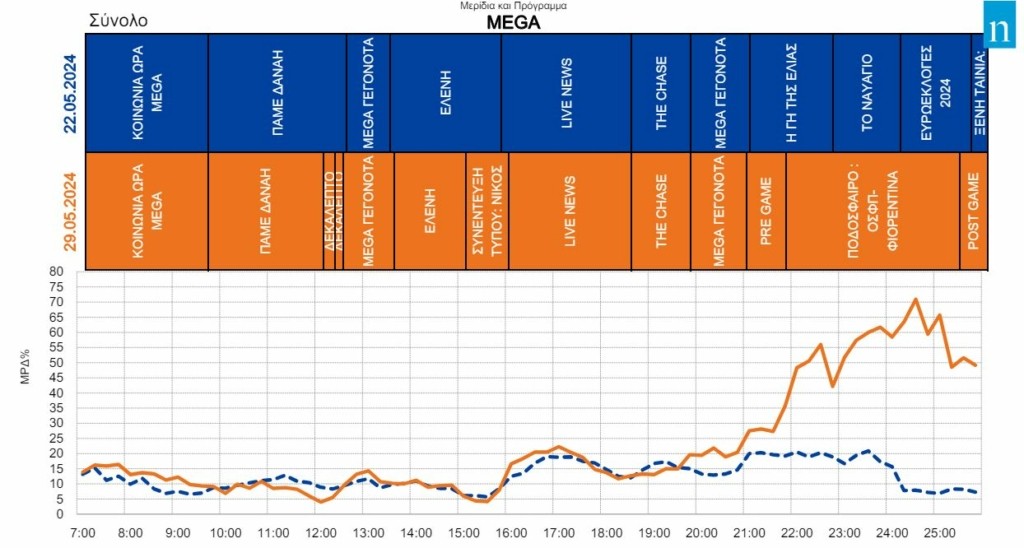Από τις 20.00 και έπειτα το πρόγραμμα του Mega μαγνήτισε, κλιμακωτά, την προσοχή τηλεθεατών με συνέπεια να επηρεαστεί ο ανταγωνισμός στο μεγαλύτερο μέρος του, σύμφωνα με τα στοιχεία της Nielsen.