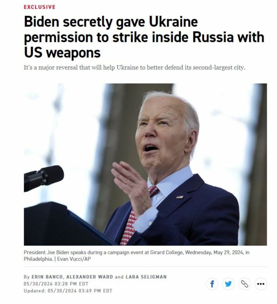 Υπενθυμίζεται ότι το Politico αποκάλυψε πως η κυβέρνηση Μπάιντεν έδωσε κρυφά στην Ουκρανία την άδεια να χτυπήσει εντός της Ρωσίας -αποκλειστικά κοντά στην περιοχή του Χάρκοβο- χρησιμοποιώντας όπλα που παρέχουν οι ΗΠΑ.