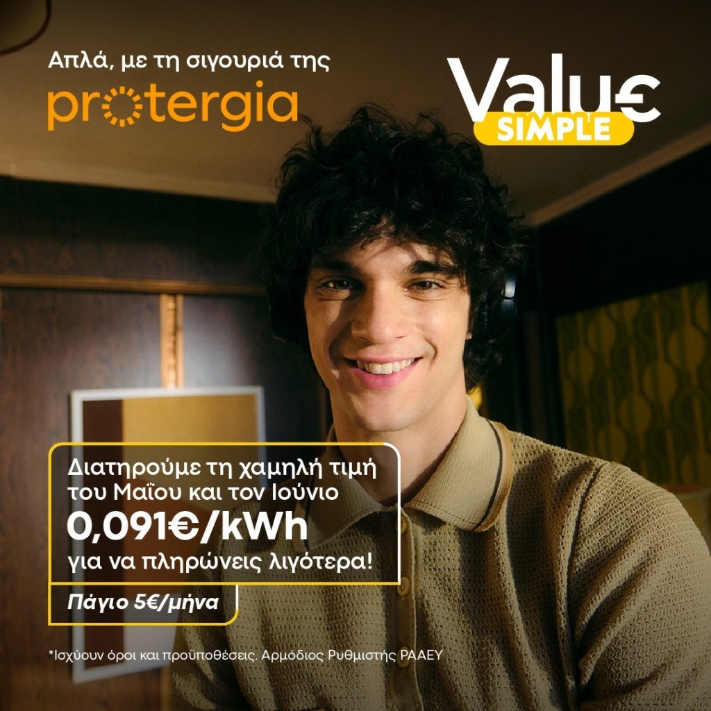 Συγκεκριμένα, το οικιακό Protergia Value Simple διατηρεί την τιμή του Μαΐου και τον Ιούνιο – 0,091€/kWh και πάγιο 5€/μήνα