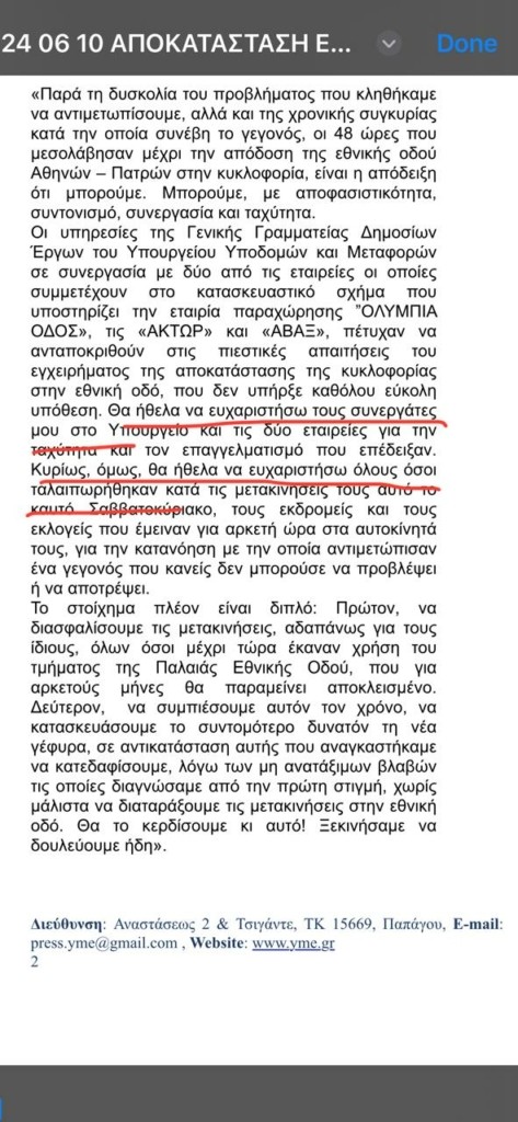 Ο υφυπουργός κάνει και κάτι άλλο: Ευχαριστεί μεν τους συνεργάτες του – αδιάφορο για τους πολίτες το τι γνώμη έχει για το επιτελείο του, αν και ενοχλητική η αποθέωση των δικών του ανθρώπων – εκφράζει και τις ευχαριστίες του για τις εταιρείες που βοήθησαν στην αποκατάσταση.