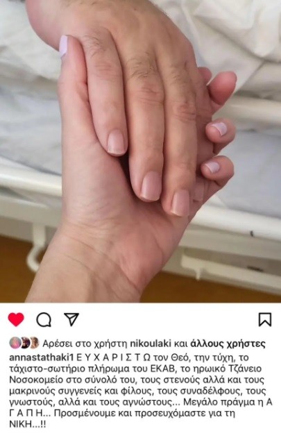 Στο στιγμιότυπο, του κρατάει το χέρι και στη λεζάντα της δημοσίευσης γράφει: «Ευχαριστώ τον Θεό, την τύχη, το τάχιστο-σωτήριο πλήρωμα του ΕΚΑΒ, το ηρωικό Τζάνειο Νοσοκομείο στο σύνολό του, τους στενούς αλλά και τους μακρινούς συγγενείς και φίλους, τους συναδέλφους, τους γνωστούς, αλλά και τους αγνώστους… Μεγάλο πράγμα η Α Γ Α Π Η… Προσμένουμε και προσευχόμαστε για τη ΝΙΚΗ…!!».