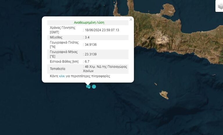 Τρεις σεισμικές δονήσεις 3, 3,4 και 3 Ρίχτερ σημειώθηκαν τα ξημερώματα μέσα σε λίγα λεπτά στο θαλάσσιο χώρο νότια της Κρήτης.
