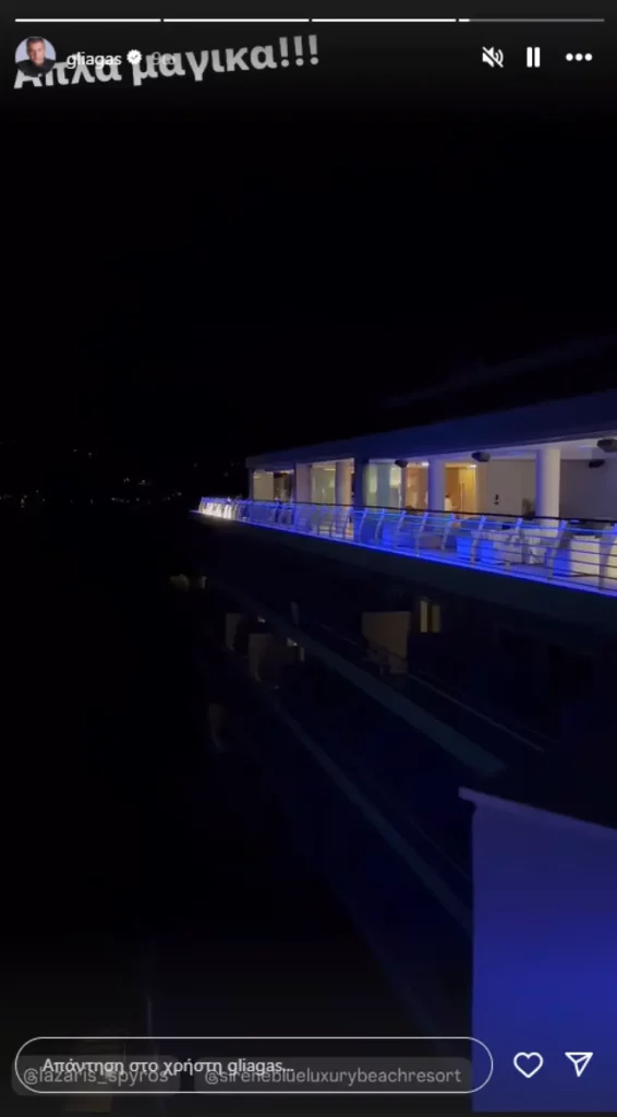 Ο Γιώργος Λιάγκας ανέβασε μια φωτογραφία με τη θέα από το ξενοδοχείο, γράφοντας: «Απλά μαγικά» και έκανε tag τον Σπύρο Λάζαρη, ενώ η Μαρία Αντωνά δημοσίευσε μια φωτογραφία με δύο ποτήρια, στο οποίο έκανε tag την Ευαγγελία Αραβανή.
