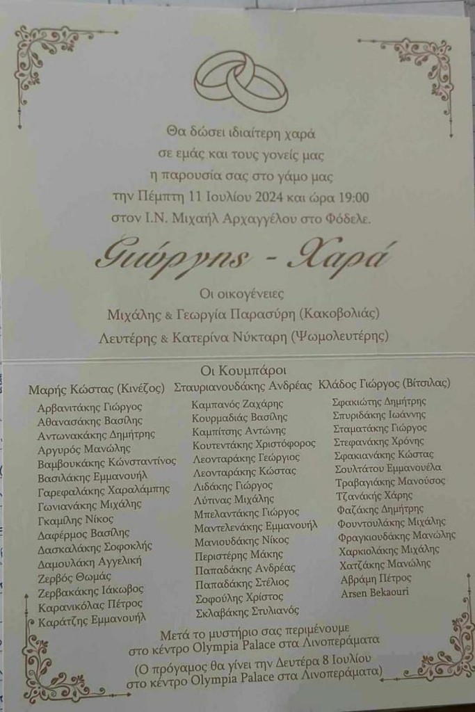 Ο Γιώργης και η Χαρά θα ενωθούν ενώπιον Θεού, ανθρώπων και…50 κουμπάρων στο μυστήριο που θα τελεστεί στον Ιερό Ναό Μιχαήλ Αρχαγγέλου στο Φόδελε του Δήμου Μαλεβιζίου.