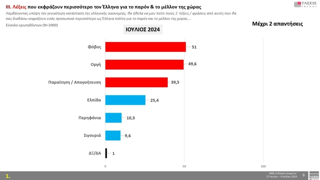 Η λέξη «φόβος» με ποσοστό 51 % εκφράζει περισσότερο τους πολίτες για το παρόν και το μέλλον της χώρας, ακολουθούν η «οργή» με 49,6 % και η «παραίτηση/απογοήτευση» με 39,5 %.