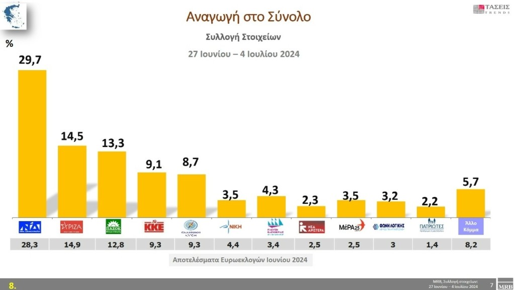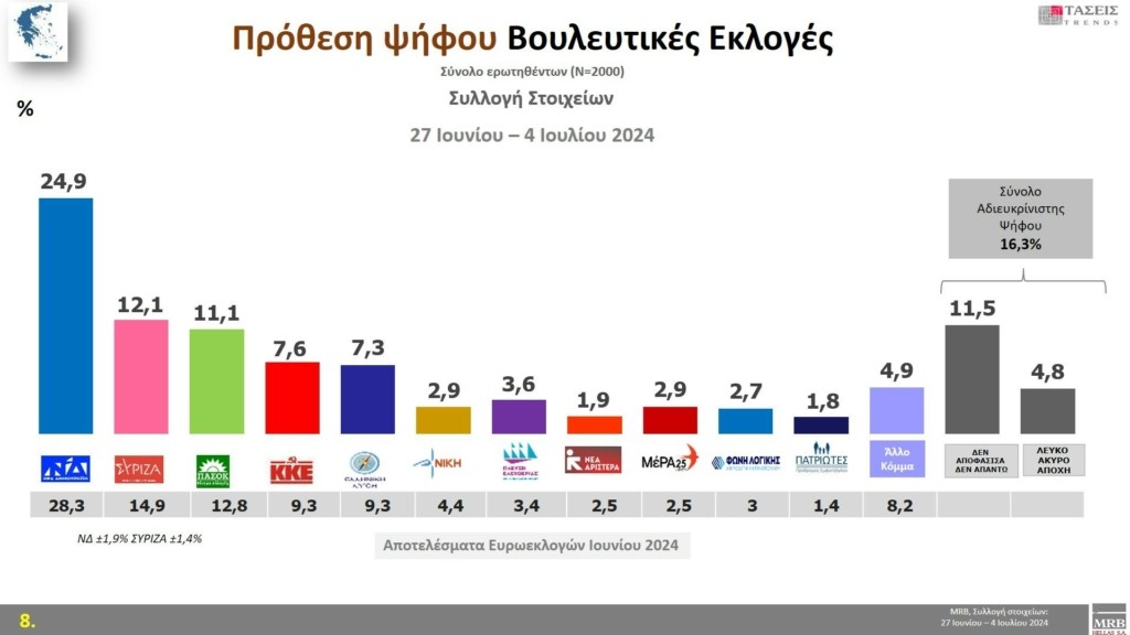 Στην πρόθεση ψήφου, η ΝΔ καταγράφει ποσοστό 24,9 % και ακολουθεί ο ΣΥΡΙΖΑ με 12,1 %. Το ΠΑΣΟΚ συγκεντρώνει 11,1 %, το ΚΚΕ 7,6 %, η Ελληνική Λύση 7,3 %, η Πλεύση Ελευθερίας 3,6 %, το ΜέΡΑ 25 2,9 %, η Νίκη 2,9 %, η Φωνή Λογικής 2,7 %, η Νέα Αριστερά 1,9% και οι Πατριώτες 1,8 %.
