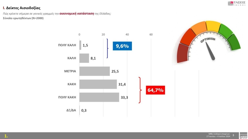 Στο ερώτημα, «πώς κρίνετε σε γενικές γραμμές σήμερα την οικονομική κατάσταση της Ελλάδας», το 64,7 % απαντά «Πολύ κακή – κακή» και το 9,7 % απαντά «Πολύ καλή-καλή».