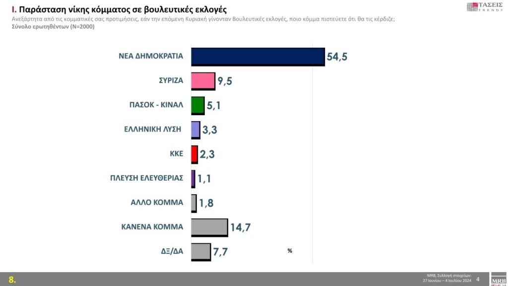 Στην παράσταση νίκης, προηγείται με 54,5 % η ΝΔ, ενώ ο ΣΥΡΙΖΑ συγκεντρώνει ποσοστό 9,5 %. το ΠΑΣΟΚ 5,1 %, η Ελληνική Λύση 3,3 %, το ΚΚΕ 2,3 %, η Πλεύση Ελευθερίας 1,1 %. Η επιλογή «Κανένα κόμμα» καταγράφει ποσοστό 14,7 %. Η επιλογή «Άλλο κόμμα» 1,8 % και «Δεν ξέρω/Δεν απαντώ» ποσοστό 7,7 %.