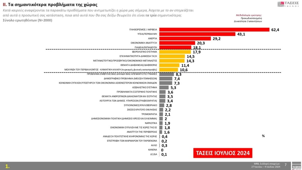 Συγκεκριμένα, οι πολίτες θεωρούν ότι τα τρία σημαντικότερα προβλήματα της χώρας είναι: πληθωρισμός/ακρίβεια με 62,4 %, υγεία/περίθαλψη με 43,1 % και ανεργία με 29,2 %.
