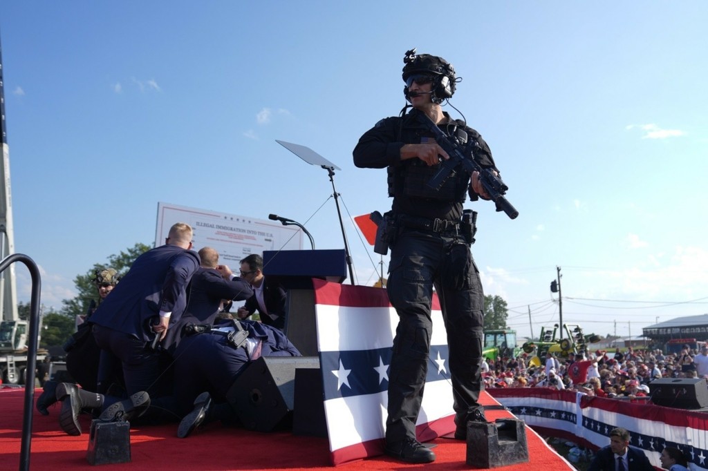 Την ώρα που μιλούσε στο κοινό που συγκεντρώθηκε να τον δει στην πόλη Μπάτλερ, ακούγεται ένας κρότος που φέρεται να είναι πυροβολισμός, χωρίς ωστόσο να έχει επιβεβαιωθεί μέχρι στιγμής. Οσοι το αντιλήφθηκαν έπεσαν κάτω, με τον Τραμπ να σκύβει και την ασφάλειά του να πέφτει όλη πάνω του.