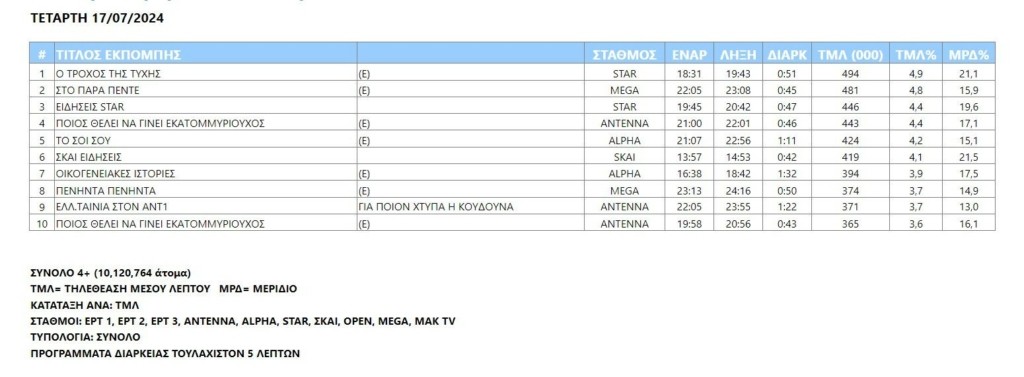 Παρόμοια τηλεθέαση με το τηλεπαιχνίδι είχε το χθεσινό επεισόδιο της σειράς «Στο παρα πέντε», η διαφορά όμως του 0,1% από το πρώτο σε προτιμήσεις πρόγραμμα που αντιστοιχεί σε 13.000 τηλεθεατές, διατήρησε στη δεύτερη θέση του τηλεβαρόμετρου τη σειρά του Γιώργου Καπουτζίδη.