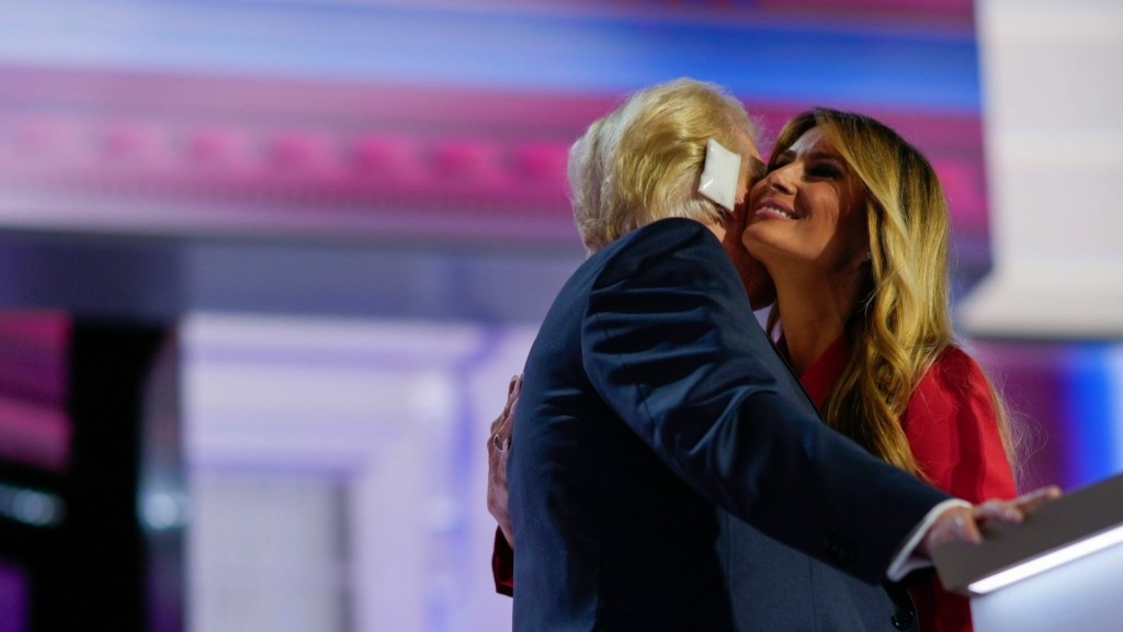 Η Μελάνια συνόδευσε τον Ντόναλντ Τραμπ στη σκηνή μετά την ομιλία του, εκείνος την αγκάλιασε και το ζευγάρι φιλήθηκε στο μάγουλο.