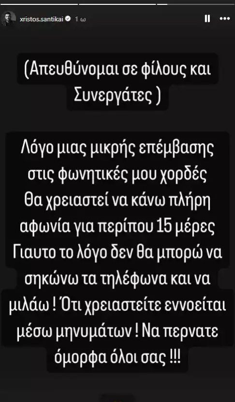 Με ένα story του στον προσωπικό του λογαριασμό στο Instagram, ο τραγουδιστής ενημέρωσε ότι το επόμενο διάστημα θα βρίσκεται σε αφωνία, πότε θα αποφεύγει να απαντά σε τηλεφωνήματα. Έτσι έστειλε μήνυμα σε φίλους και συνεργάτες να επικοινωνούν μαζί του μόνο με γραπτά μηνύματα στο κινητό του τηλέφωνο.