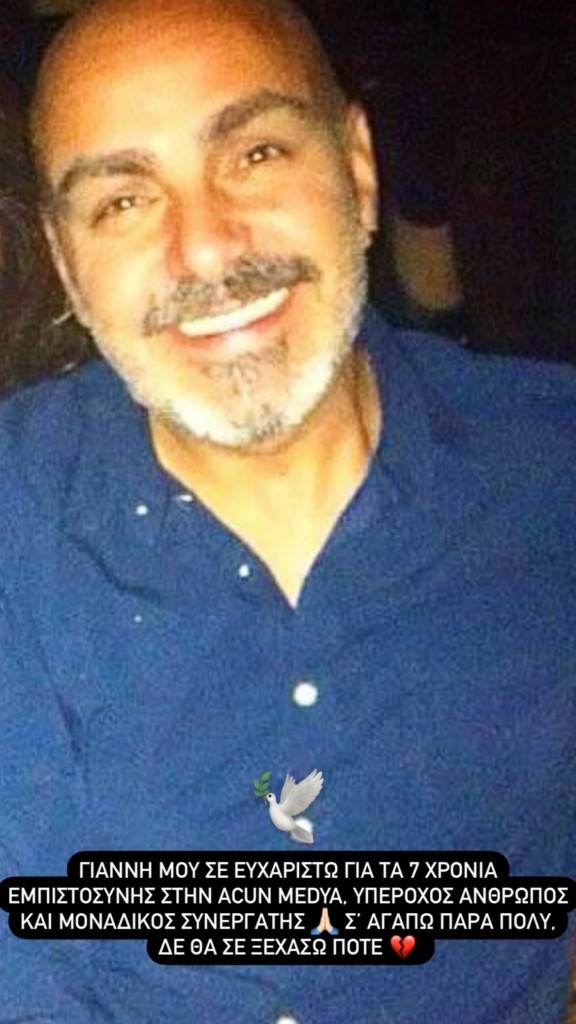 «Γιάννη μου σε ευχαριστώ για τα 7 χρόνια εμπιστοσύνης στην Acun Medya. Υπέροχος άνθρωπος και μοναδικός συνεργάτης. Σ’ αγαπώ πάρα πολύ, δεν θα σε ξεχάσω ποτέ», έγραψε η Έλενα Παπαρίζου.
