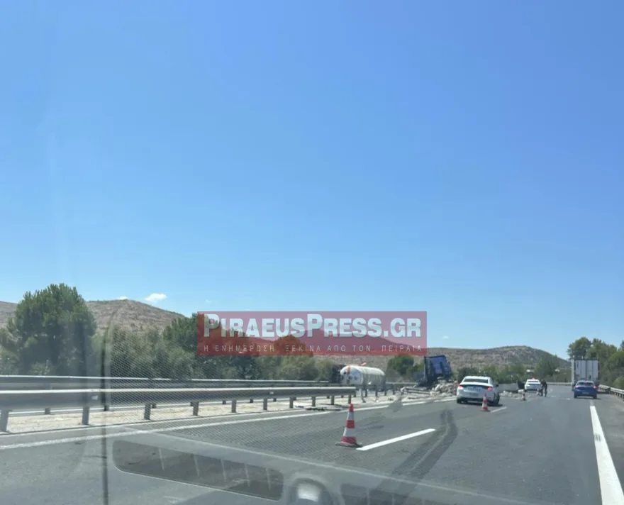 Ο τράκτορας «καρφώθηκε» πάνω στο διαχωριστικό, ενώ το βυτίο ανετράπη στο ρεύμα κυκλοφορίας προς Αθήνα.