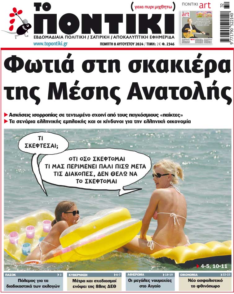 Με πρωτοσέλιδο τίτλο «Φωτιά στη σκακιέρα της Μέσης Ανατολής» και αναλυτικό – αποκαλυπτικό ρεπορτάζ για τις ασκήσεις ισορροπίας σε τεντωμένο σκοινί από τους παγκόσμιους «παίκτες», αλλά και για τα σενάρια ελληνικής εμπλοκής και τους κινδύνους για την ελληνική οικονομία, κυκλοφορεί το «ΠΟΝΤΙΚΙ» το πρωί της Πέμπτης.