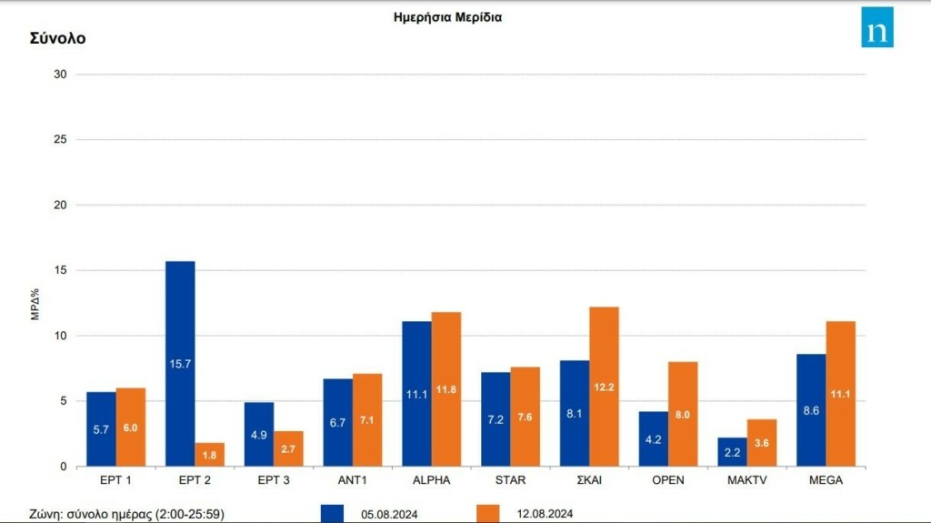 Δεύτερη επιλογή αποτέλεσε ο Alpha και το τρίτο σε μέγεθος μερίδιο, από τη ημερήσια πίτα τηλεθέασης της Nielsen, απέσπασε το Mega.