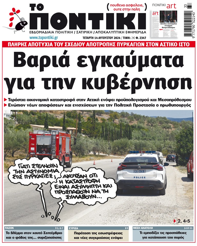 Με πρωτοσέλιδο τίτλο «Βαριά εγκαύματα για την κυβέρνηση» και αναλυτικό – αποκαλυπτικό ρεπορτάζ για την τεράστια οικονομική καταστροφή στην Αττική ενόψει προϋπολογισμού και Μεσοπρόθεσμου, αλλά και για τον πρωθυπουργό που βρίσκεται ενώπιον νέων αποφάσεων και ενισχύσεων για την Πολιτική Προστασία, κυκλοφορεί εκτάκτως το «ΠΟΝΤΙΚΙ» το πρωί της Τετάρτης.