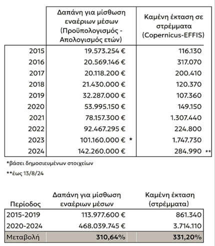 Ο Μανώλης Καπνισάκης σε δήλωση του παραθέτει πίνακα με στοιχεία υποστηρίζοντας ότι ενώ την τελευταία πενταετία έχουν τριπλασιαστεί οι ετήσιες κρατικές δαπάνες για τη μίσθωση εναέριων μέσων, εντούτοις έχουν τριπλασιαστεί και οι καμένες εκτάσεις.