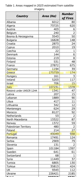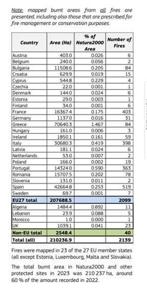 Η χώρα μας κατέχει πλέον τη θλιβερή πρωτιά στην Ε.Ε. τόσο στην αναλογία καμένης έκτασης ανά αριθμό πυρκαγιών (το 2023 κάθε πυρκαγιά στην Ελλάδα έκαψε κατά μέσο όρο 10.090 στρέμματα, όταν στην Ιταλία έκαψε 780 και στη Γαλλία 410), όσο και σε ποσοστό καμένης έκτασης χαρακτηρισμένος ως “Νatura 2000″(από το σύνολο των 1.750.000 στρεμμάτων που κάηκαν το 2023, τα 706.400 βρίσκονταν σε τοποθεσίες “Natura 2000”, που ανέρχονται στο 40% του συνόλου των καμένων εκτάσεων. Το 2023 η Ελλάδα βρέθηκε στην πρώτη θέση με τα περισσότερα εκτάρια καμένης γης σε περιοχές “Natura 2000” σε απόλυτο αριθμό).