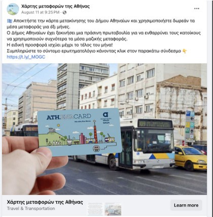 «Διαφήμιση που έχει αναρτηθεί σε κοινωνικά δίκτυα σχετικά με κάρτα μετακίνησης που παρουσιάζεται ως κάρτα του Δήμου Αθηναίων και παρέχει δωρεάν μετακινήσεις με τα μέσα μεταφοράς. Παρακαλούμε τους κατοίκους της Αθήνας να είναι ιδιαίτερα προσεκτικοί και να αγνοούν πληροφορίες, που προέρχονται από μη επίσημες πηγές του Δήμου. Οι επίσημες ανακοινώσεις και ενέργειες του Δήμου Αθηναίων θα επικοινωνούνται αποκλειστικά και μόνο μέσω των επίσημων καναλιών του όπως ο επίσημος ιστότοπος και οι αναγνωρισμένες του σελίδες στα μέσα κοινωνικής δικτύωσης. Για οποιαδήποτε διευκρίνιση ή απορία, οι κάτοικοι μπορούν να επικοινωνούν με τις αρμόδιες υπηρεσίες του Δήμου Αθηναίων» ανέφερε ο Δήμος σε ανακοίνωσή του.