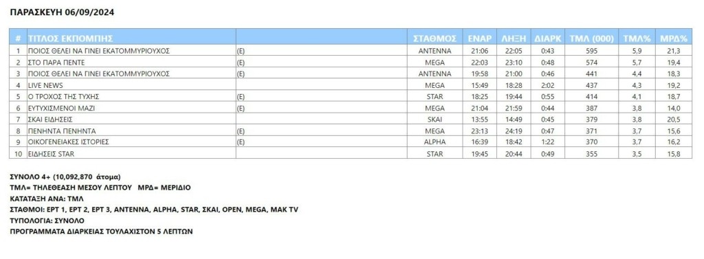 Στη δεκάδα της ημέρας, εξάλλου, πλασαρίστηκε το κεντρικό δελτίο ειδήσεων του Star.