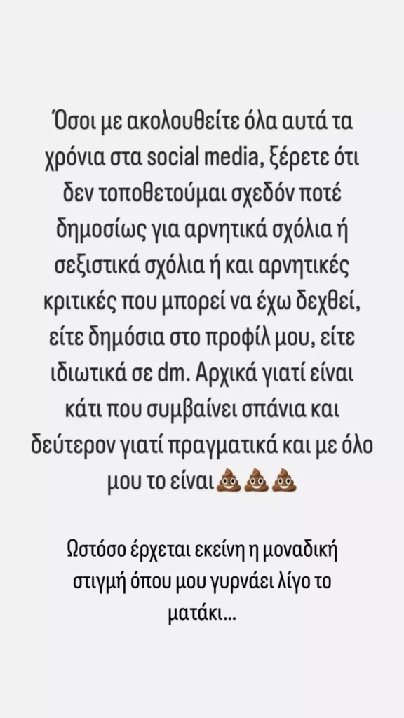 «Όσοι με ακολουθείτε όλα αυτά τα χρόνια στα social media, ξέρετε ότι δεν τοποθετούμε σχεδόν ποτέ δημοσίως για αρνητικά σχόλια ή σεξιστικά σχόλια ή και αρνητικές κριτικές που μπορεί να έχω δεχτεί, είτε δημόσια στο προφίλ μου είτε ιδιωτικά σε dm. Αρχικά γιατί είναι κάτι που συμβαίνει σπάνια και δεύτερον γιατί πραγματικά και με όλο μου το είναι χ@@ηκα. Ωστόσο έρχεται εκείνη μοναδική στιγμή που μου γυρνάει λίγο το ματάκι…