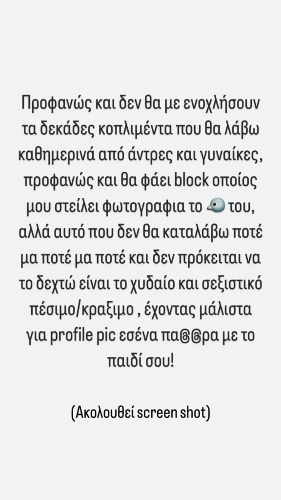 Προφανώς και δεν θα με ενοχλήσουν τα δεκάδες κομπλιμέντα που θα λάβω καθημερινά από άντρες και γυναίκες, προφανώς και θα φάει μπλοκ όπως μου στείλει φωτογραφία το πουλί του, αλλά αυτό που δεν θα καταλάβω ποτέ μα ποτέ μα ποτέ και δεν πρόκειται να το δεχτώ είναι το χυδαίο και σεξιστικό πέσιμο/κράξιμο, έχοντας μάλιστα για profile pic εσένα πα@@@ρα με το παιδί σου! (Ακολουθεί screenshot)