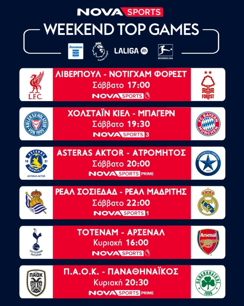 Στην Premier League, το κορυφαίο πρωτάθλημα στον κόσμο με τους 380 αγώνες LIVE και με τη φωνή του Χρήστου Σωτηρακόπουλου,, δεσπόζει στα κανάλια Novasports το ντέρμπι του Λονδίνου, Τότεναμ – Άρσεναλ (15/9, 16:00) καθώς και οι αγώνες Μάντσεστερ Σίτι – Μπρέντφορντ (14/9, 17:00), Λίβερπουλ – Νότιγχαμ Φόρεστ (14/9, 17:00), Σαουθάμπτον – Μάντσεστερ Γιουνάιτεντ (14/9, 14:30). Η Premier League θα πλαισιωθεί με τις εκπομπές «Premier League Kick Off» και «Premier League The Show» με τον Άγγελο Στυλιάδη.