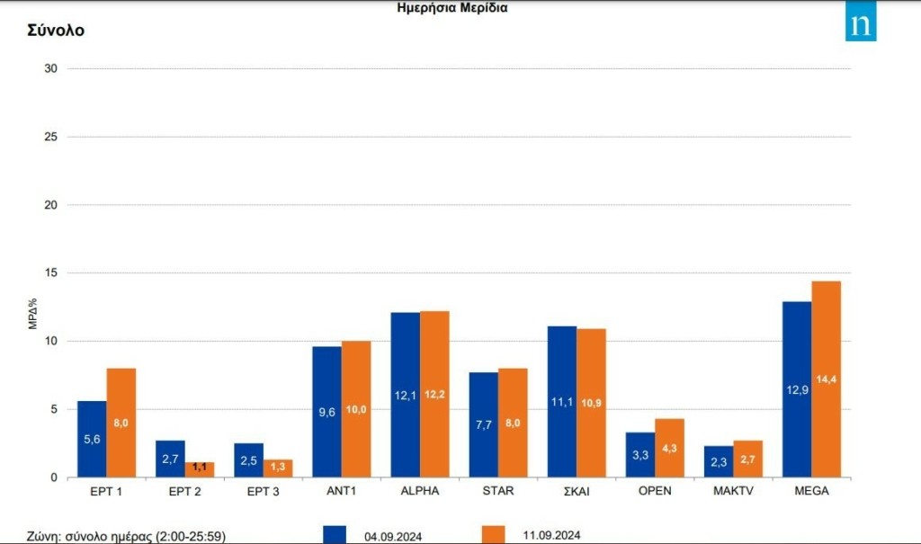 Έπειτα από το προχθεσινό «μπαμ» τηλεθέασης του Alpha λόγω της ποδοσφαιρικής αναμέτρησης Ιρλανδίας- Ελλάδας, το Mega χθες ανέκτησε την πρώτη θέση στις προτιμήσεις του τηλεοπτικού κοινού και με ανεβασμένη επίδοση ακόμα σε σύγκριση με εκείνης που είχε καταφέρει την Δευτέρα (14,1%), σύμφωνα με τις δυναμομετρήσεις της Nielsen.