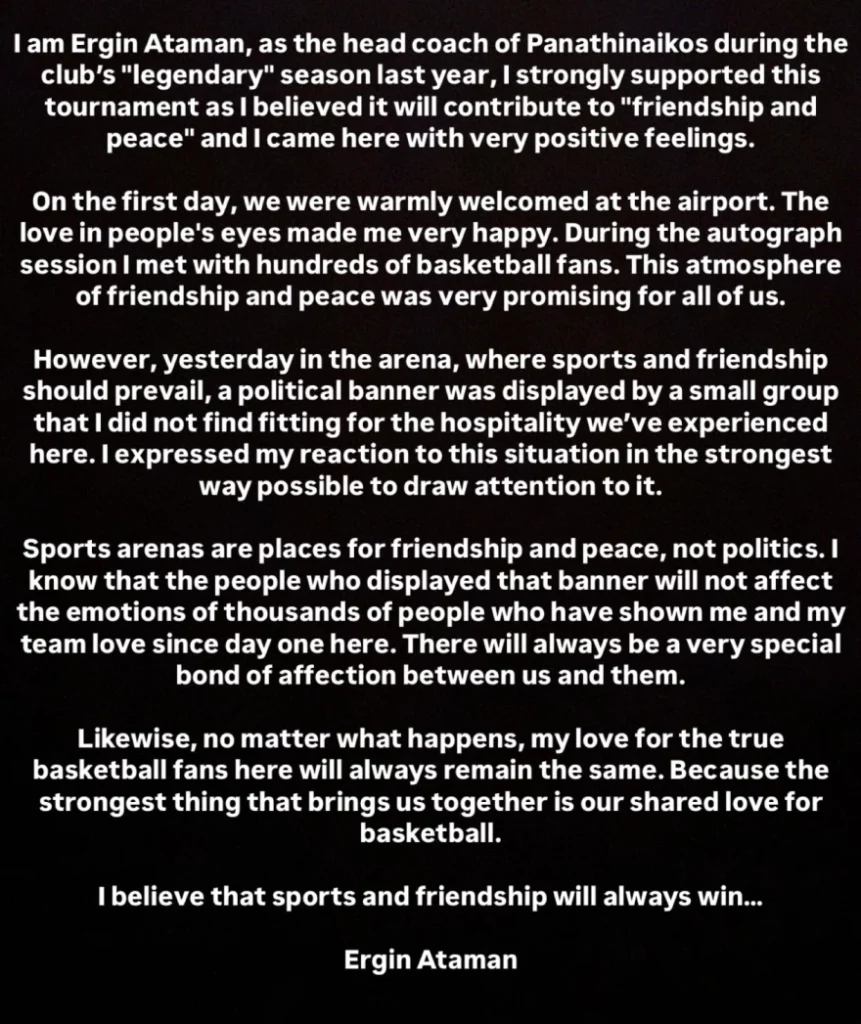 Την αντίθεσή του για το πανό που αναρτήθηκε χθες κατά τη διάρκεια της αναμέτρησης Παναθηναϊκός – Μακάμπι και αναφερόταν στην τουρκική εισβολή στην Κύπρο εξέφρασε με ανάρτησή του ο προπονητής του Παναθηναϊκού, Εργκίν Αταμάν.
