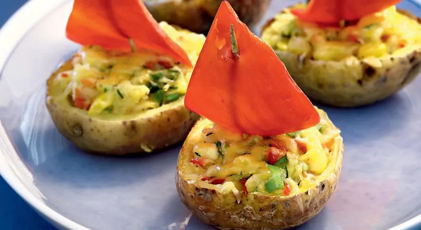 7. Ψήστε τις πατάτες για 15- 20 λεπτά σε καλά προθερμασμένο φούρνο στους 180ο C στον αέρα. Σερβίρετέ τις σαν βαρκούλες με κομμάτια πιπεριάς στερεωμένα σε οδοντογλυφίδα, σαν πανιά.