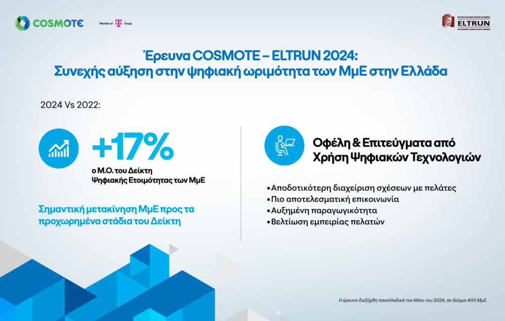 Συνεχής αύξηση στην ψηφιακή ωριμότητα των μικρομεσαίων επιχειρήσεων (ΜμΕ) παρατηρήθηκε το 2024 στη χώρα μας, σύμφωνα με την έρευνα «Η Ψηφιακή Ετοιμότητα των Μικρομεσαίων Επιχειρήσεων στην Ελλάδα»,που εκπόνησε το Εργαστήριο Ηλεκτρονικού Εμπορίου (ELTRUN) του Οικονομικού Πανεπιστημίου Αθηνών σε συνεργασία με την COSMOTE.Όπως προκύπτει από την έρευνα, καταγράφεται αύξηση 17% στον μέσο όρο του Δείκτη Ψηφιακής Ετοιμότητας σε σχέση με το 2022. Η διαχείριση σχέσεων με πελάτες, η αποτελεσματική επικοινωνία και η βελτίωση της εμπειρίας πελάτη είναι τα κυριότερα οφέλη από τη χρήση ψηφιακών τεχνολογιών.