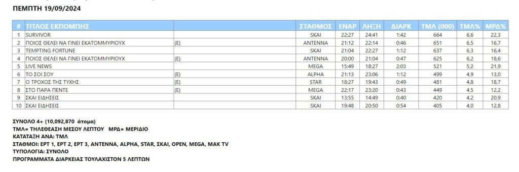 Κρατήθηκε πρώτο σε προτιμήσεις πρόγραμμα το «Survivor», όμως χθες «απειλήθηκε» από το τηλεπαιχνίδι «Ποιος θέλει να γίνει εκατομμυριούχος» των 21.00. Στο ζύγι το «ειδικό βάρος» έχει σημασία και κάνει την διαφορά.