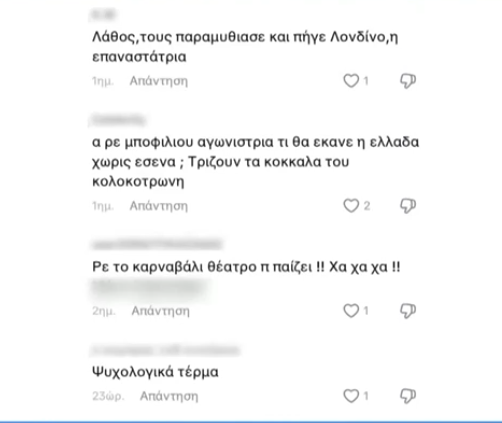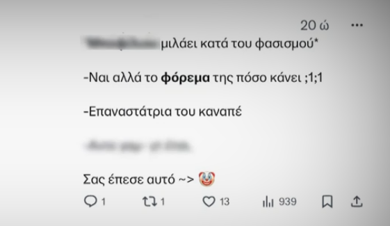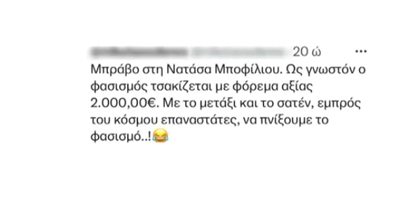 «Mε φόρεμα 2.000 ευρώ τσακίζεται ο φασισμός», «Τους πνίγεις τους φασίστες με μετάξι και σατέν», «επαναστάτρια του καναπέ», ήταν λίγα μόνο από τα ειρωνικά σχόλια που γράφτηκαν στο «Χ» (πρώην Twitter).