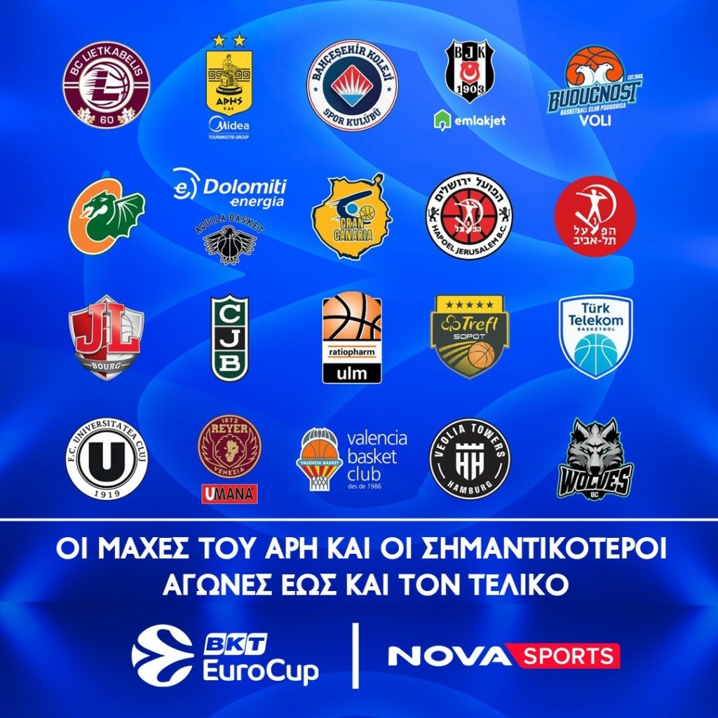Tζάμπολ έχουμε στο παρκέ του Novasports με τη φετινή διοργάνωση του EuroCup και τον Άρη Midea να εκπροσωπεί την Ελλάδα. Στην πρεμιέρα οι φίλοι του μπάσκετ θα απολαύσουν στα κανάλια Novasports, Βενέτσια – Άρης Midea (25/9, 22:00) καθώς και τους αγώνες Άνκαρα-Λιετκαμπέλις (24/9, 19:30), Αμβούργο-Μπουργκ (24/9, 20:30), Μπανταλόνα-Χάποελ Τελ Αβίβ (24/9, 21:30), Γκραν Κανάρια-Τρέντο (24/9, 22:00), Κλουζ Ναπόκα-Τσεντεβίτα Ολίμπια (25/9, 19:00), Χάποελ Ιερουσαλήμ-Βαλένθια (25/9, 20:00) και Μπεσίκτας-Μπουντούτσνοστ (25/9, 20:00).