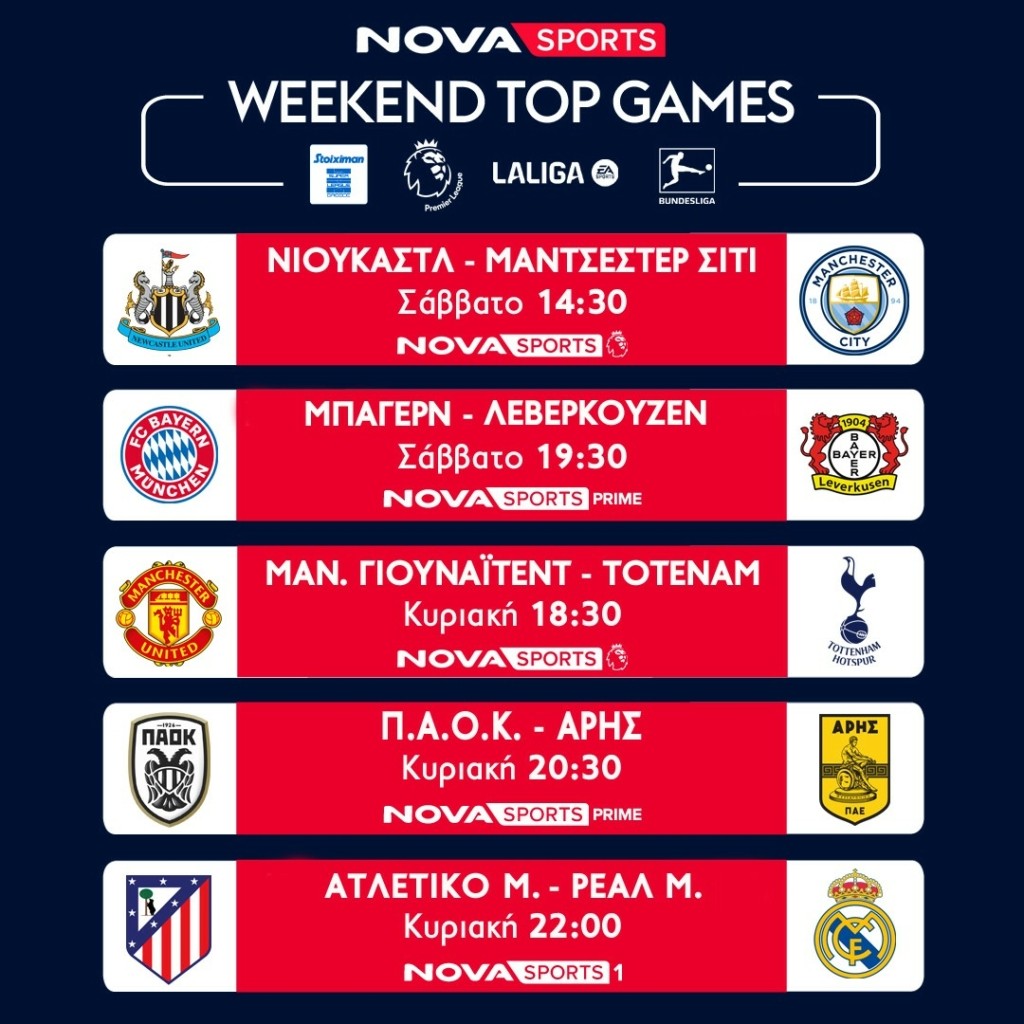 Η Stoiximan Super League συνεχίζεται με την 6η αγωνιστική και το «El Clasico» της Θεσσαλονίκης, ΠΑΟΚ – Άρης (29/9 20:30) που θα διεξαχθεί στο γήπεδο της Τούμπας και θα μεταδοθεί από τα κανάλια Novasports, όπως και ο αγώνας Asteras AKTOR-Λεβαδειακός (28/9, 20:00). Στα κανάλια Cosmote Sport θα προβληθεί το ντέρμπι της OPAP Arena, ΑΕΚ – Παναθηναϊκός (29/9, 21:00) όπως και οι αναμετρήσεις Βόλος ΝΠΣ-Athens Kallithea FC (28/9, 17:00), ΟΦΗ – Παναιτωλικός (29/9, 17:00), Ολυμπιακός – Ατρόμητος (29/9, 19:00), ΠΑΣ Λαμία – Πανσερραϊκός (30/9, 20:00). Οι αγώνες του ελληνικού πρωταθλήματος θα πλαισιωθούν στο Novasports και με την αγαπημένη εκπομπή των φιλάθλων «Η Ώρα των Πρωταθλητών» με τους Γιαννίκο Δούσκα, Λίλα Κουντουριώτη, Χριστίνα Κομίνη αλλά και με τον «Monday Football Club» με τους Ντέμη Νικολαϊδη και Γιάννη Πάγκο.