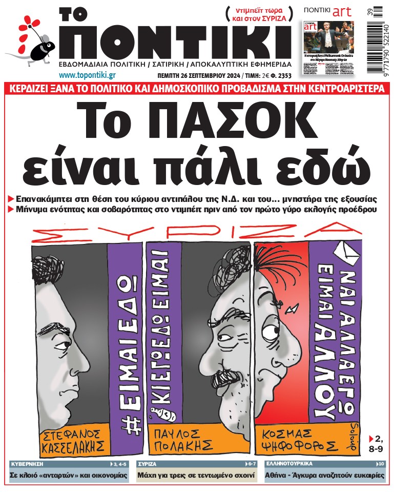 Με πρωτοσέλιδο τίτλο «Το ΠΑΣΟΚ είναι πάλι εδώ» και αναλυτικό – αποκαλυπτικό ρεπορτάζ για το ότι επανακάμπτει στη θέση του κύριου αντιπάλου της Ν.Δ. και του…. μνηστήρα της εξουσίας, αλλά και το μήνυμα ενότητας και σοβαρότητας στο ντιμπέιτ πριν από τον πρώτο γύρο εκλογής προέδρου, κυκλοφορεί το «ΠΟΝΤΙΚΙ» το πρωί της Πέμπτης.