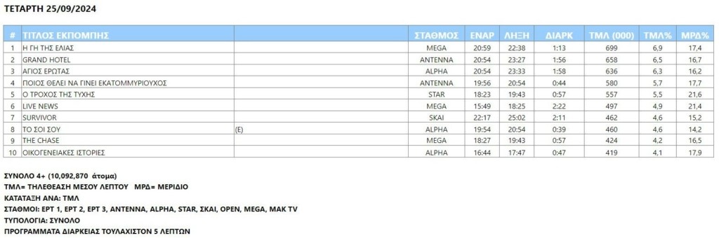 Πρώτο σε τηλεθέαση το Mega και την Τετάρτη – Στην δεύτερη θέση ο Alpha