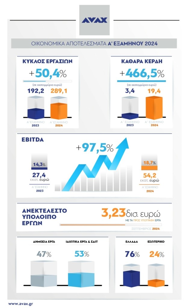 Σημαντική αύξηση του κύκλου εργασιών, των καθαρών κερδών, του EBITDA και περαιτέρω μείωση του καθαρού δανεισμού παρουσιάζει ο Όμιλος ΑΒΑΞ, ανακοινώνοντας τα οικονομικά αποτελέσματα του α’ 6μήνου του 2024, που πιστοποιούν την ηγετική του παρουσία και τις προοπτικές του στα μεγάλα έργα υποδομών.