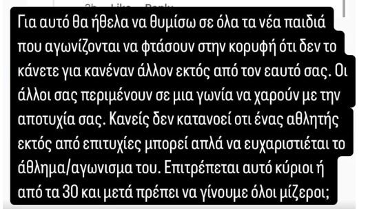 Όταν είμαι 8η στον κόσμο (γιατί μιλάμε για τις καλύτερες του κόσμου) γέρασα» έγραψε αρχικά και στη συνεχεία παρότρυνε τα νέα παιδιά να δουλεύουν για τον εαυτό τους και μόνο γιατί κάποιοι άνθρωποι θα περιμένουν σε μια γωνία για να χαρούν με την αποτυχία σας.