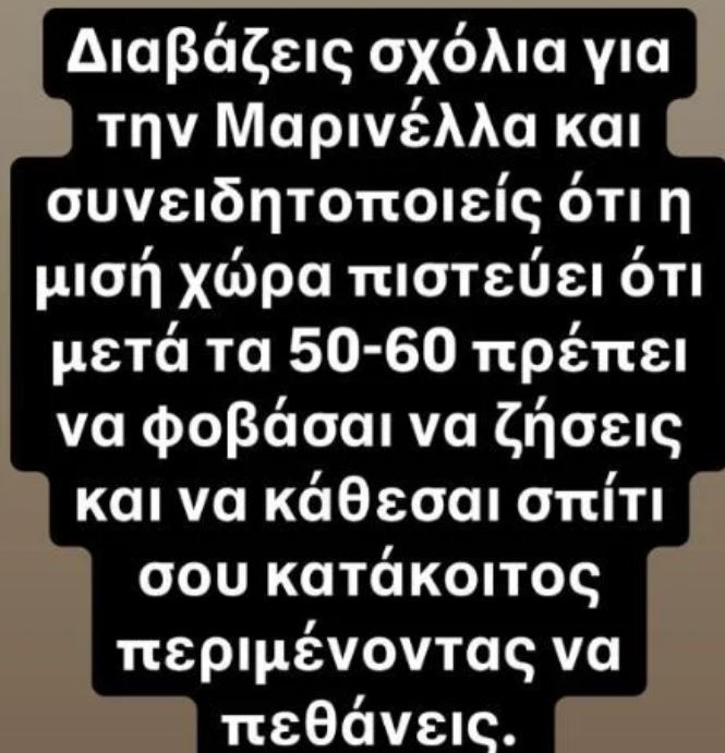 «Διαβάζεις σχόλια για την Μαρινέλλα και συνειδητοποιείς ότι η μισή χώρα πιστεύει ότι μετά τα 50-60 πρέπει να φοβάσαι να ζήσεις και να κάθεσαι σπίτι σου κατάκοιτος περιμένοντας να πεθάνεις» αναφέρει.