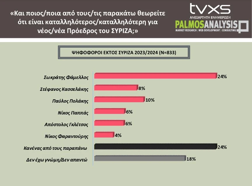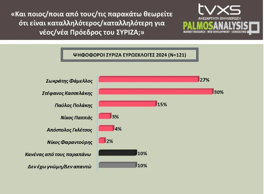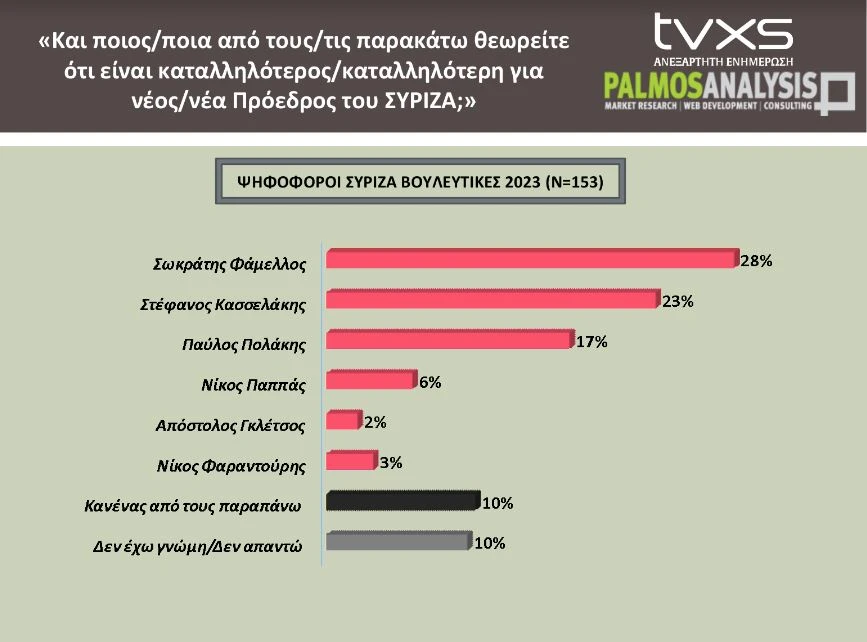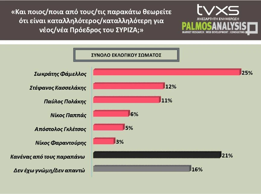 Σε ο,τι αφορά τον ΣΥΡΙΖΑ, στο σύνολο του εκλογικού σώματος, οι πολίτες σε ποσοστό 25% θεωρούν καταλληλότερο για νέο πρόεδρο του κόμματος τον Σωκράτη Φάμελλο και ακολουθούν ο Στέφανος Κασσελάκης με 12%, ο Παύλος Πoλάκης με 11%, ο Νίκος Παππάς με 6%, ο Απόστολος Γκλέτσος με 5% και ο Νίκος Φαραντούρης με 3%.