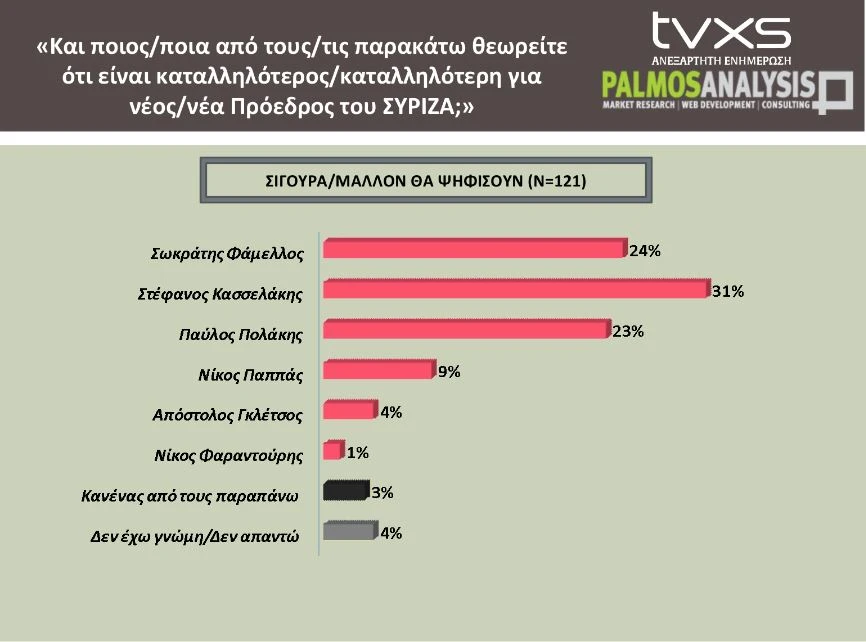 Σωκράτης Φάμελλος 28%, Στέφανος Κασσελάκης 23%, Παύλος Πολάκης 17%, Νίκος Παππάς 6%, Απόστολος Γκλέτσος 2%, Νίκος Φαραντούρης 3%.