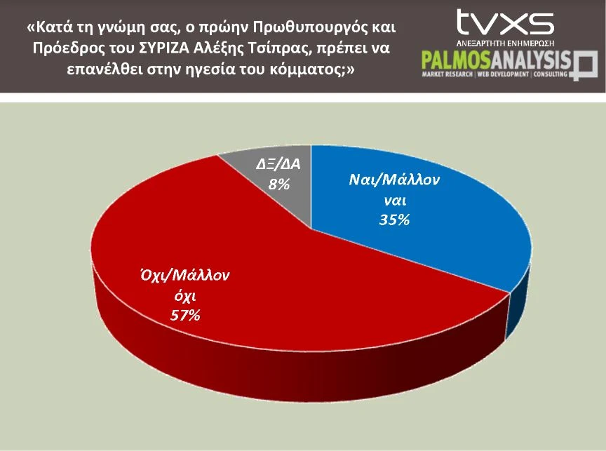 Στην ερώτηση αν ο Αλέξης Τσίπρας, πρέπει να επανέλθει στην ηγεσία του κόμματος, το 57% απαντά «όχι/μάλλον όχι», ενώ «ναι/μάλλον ναι» απαντά το 35%.