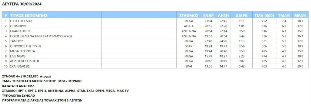 Με πρωτιά τηλεθέασης το Mega «αποχαιρέτισε» τον Σεπτέμβριο
