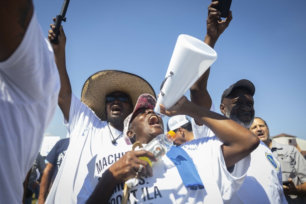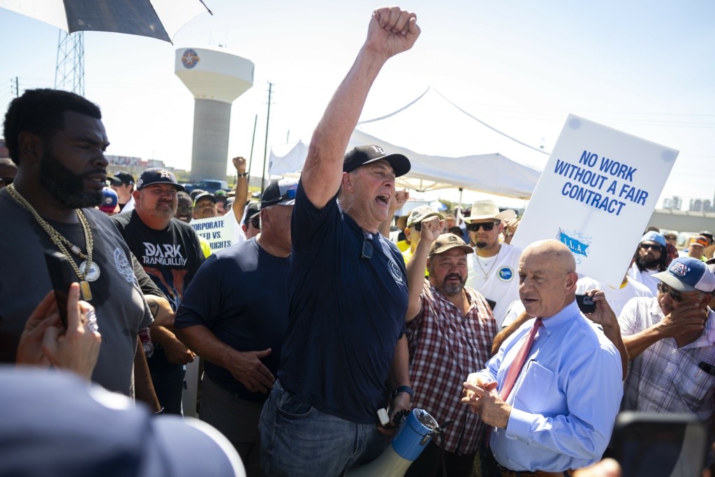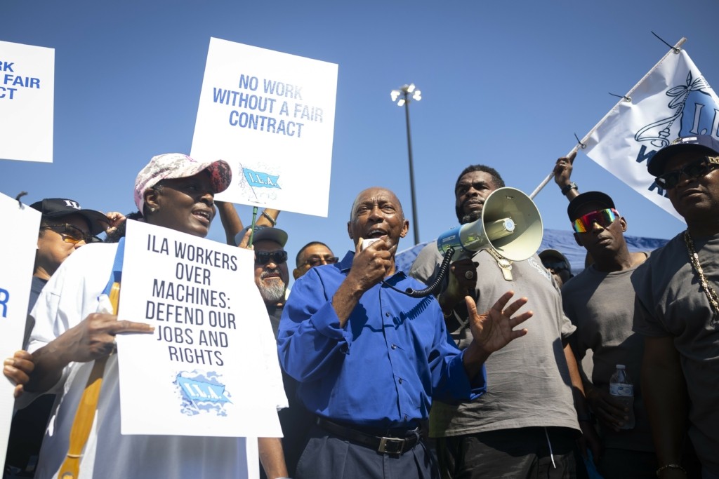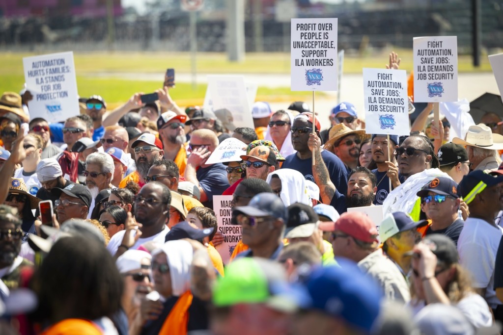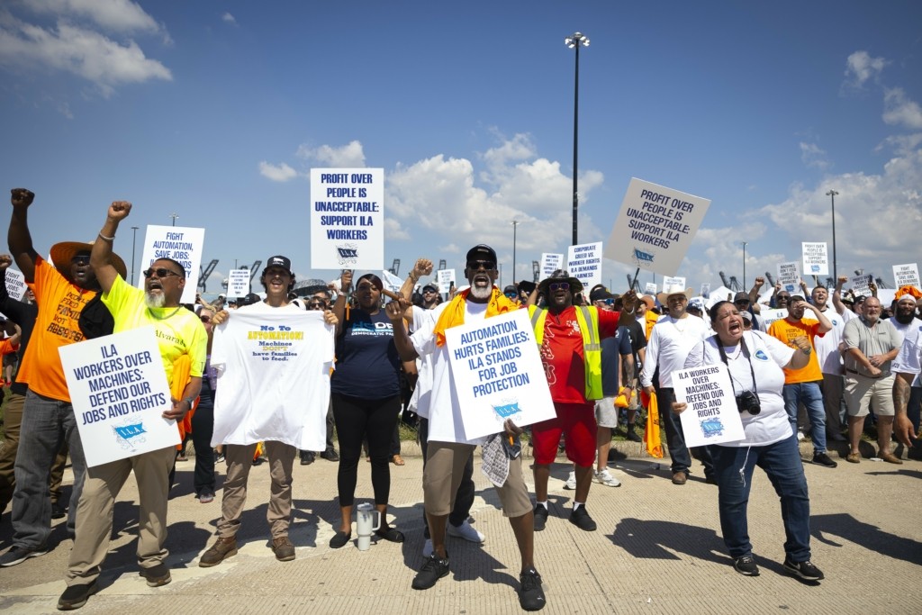 Εκατοντάδες λιμενεργάτες διαδήλωσαν χθες σε ναυτιλιακό τερματικό σταθμό της περιοχής της Πόλης της Νέας Υόρκης στο Ελίζαμπεθ του Νιού Τζέρσι κρατώντας πλακάτ και φωνάζοντας συνθήματα όπως «ILA μέχρι τέλους!».