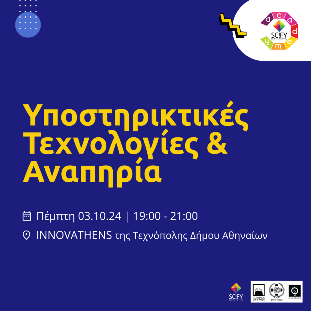 03.10 || SciFY Academy | Υποστηρικτικές Τεχνολογίες και Αναπηρία | Τί είναι η Υποστηρικτική Τεχνολογία; Πώς επηρεάζει την ποιότητα ζωής των ατόμων με αναπηρία κι όχι μόνο; Ποια “εργαλεία” υπάρχουν και για ποιες αναπηρίες; Πού βρισκόμαστε στην Ελλάδα στο χώρο αυτό; Ποιες νέες τεχνολογίες προσφέρει η πληροφορική για τα ΑμεΑ; Τι είναι η ψηφιακή προσβασιμότητα και πως σχετίζεται με τις Υποστηρικτικές Τεχνολογίες; Ποιο το μέλλον των Υποστηρικτικών Τεχνολογιών και πώς συμβάλλει η Τεχνητή Νοημοσύνη;Καθηγητές, ερευνητές και έμπειροι επαγγελματίες στον χώρο της εργοθεραπείας και της νευροαποκατάστασης θα μας μιλήσουν με απλά λόγια για τις Υποστηρικτικές Τεχνολογίες και τον ρόλο τους στην αναπηρία σήμερα!