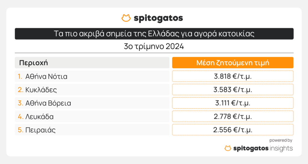 Τα Νότια Προάστια της Αθήνας, οι Κυκλάδες, τα Βόρεια Προάστια της Αθήνας, η Λευκάδα και ο Πειραιάς αποτελούν τις 5 πιο ακριβές περιοχές της χώρας για αγορά κατοικίας κατά το τρίτο τρίμηνο του 2024.