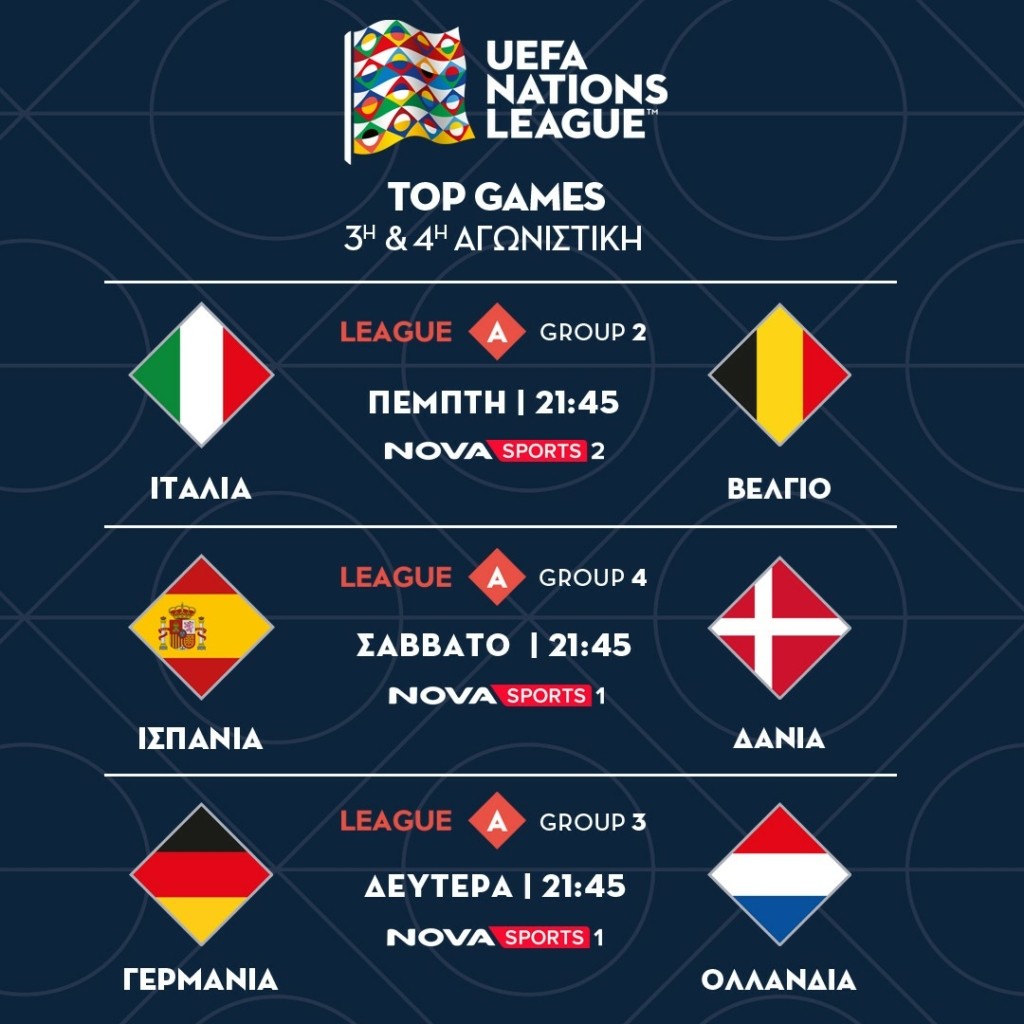 Τα αθλητικά κανάλια της Nova και σύσσωμη η δημοσιογραφική ομάδα του Novasports, με παρουσία σε τηλεόραση και digital media, θα μεταδώσουν ΟΛΟΥΣ τους αγώνες, προσφέροντας εκπομπές ανάμεσα στα ματς καθώς και Λεπτό προς Λεπτό με τον Νίκο Τζουάννη την εξέλιξη όλων των αναμετρήσεων-σε παράλληλη ώρα διεξαγωγής- ώστε να μη χάσει κανείς στιγμή από τις δυνατές αναμετρήσεις της διοργάνωσης. Από τους υπόλοιπους αγώνες της 3ης και 4ης αγωνιστικής ξεχωρίζουν οι αγώνες Ιταλία – Βέλγιο (10/10, 21:45), Ισπανία – Δανία (12/10, 21:45), Βέλγιο – Γαλλία (14/10, 21:45), Γερμανία – Ολλανδία (14/10, 21:45), Ισπανία – Σερβία (15/10, 21:45).
